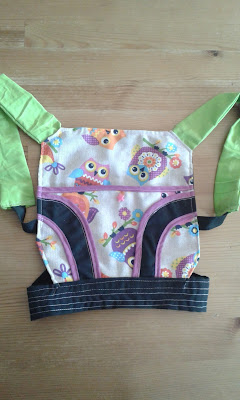 Cuando os enseñé el capazo para el muñeco de P., no os enseñé la mochila que le hice a juego, para que lo portease igual que hace su mamá con J. Tela de búhos a juego con el capazo, y líneas imitando la mochila de mami .